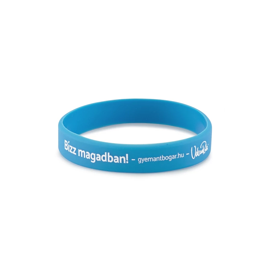 Foszforeszkáló, sötétben világító karkötő világoskék szitanyomott írással és Vámos Robis aláírással.