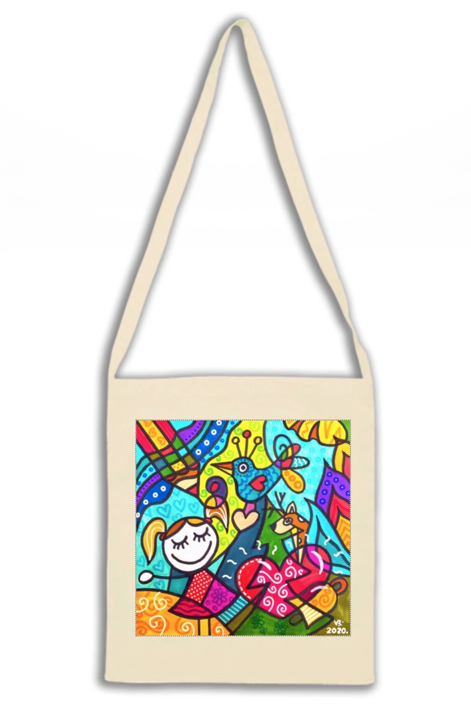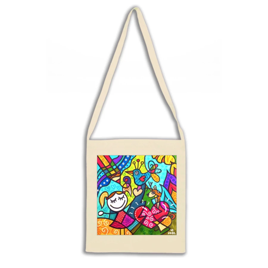 Pamut vászontáska vállra tehető pánttal, egyik oldalt szeretet-színes mintával.